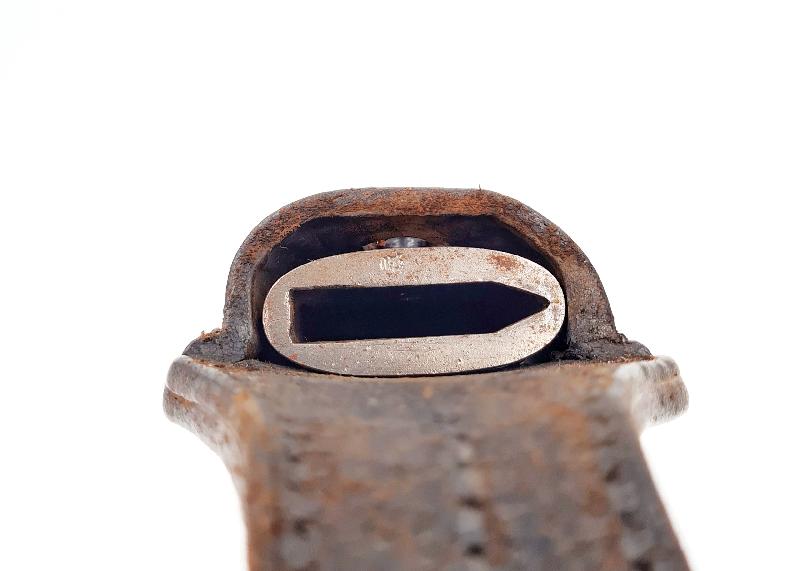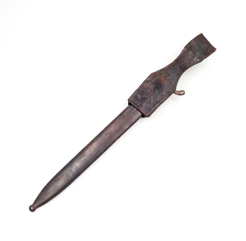 Porte fourreau en cuir, percé d'un petit trou en son centre afin d'y fixer la baïonnette à une poutre.