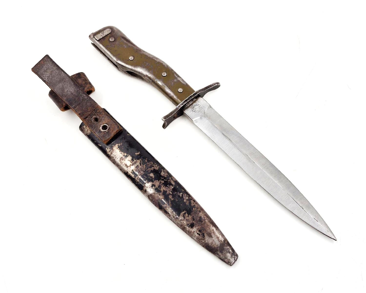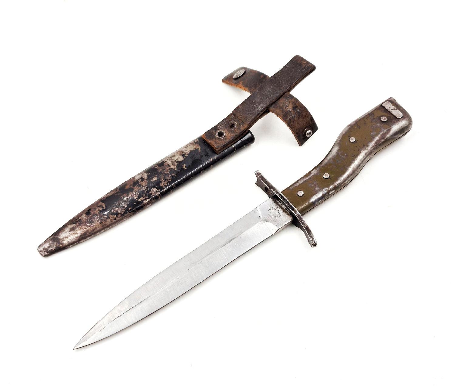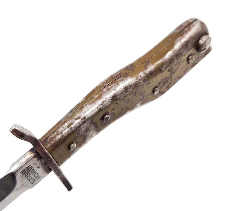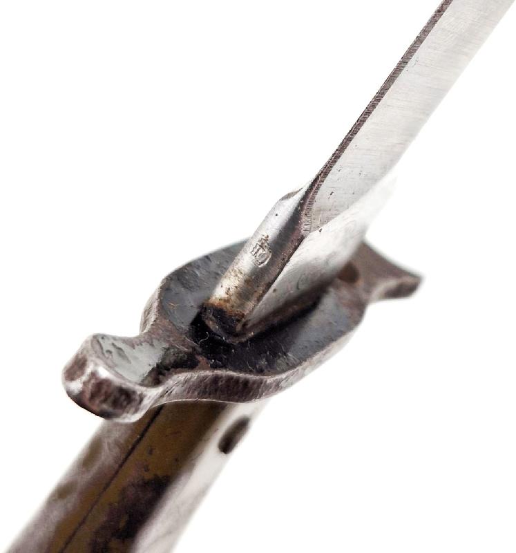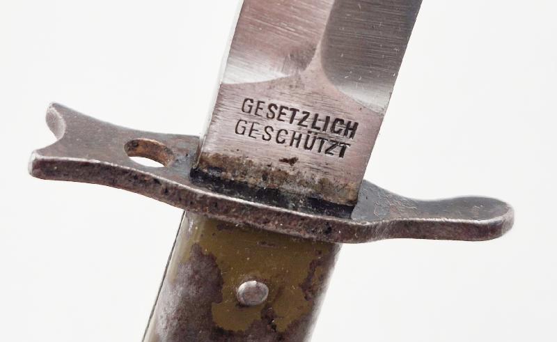 Belle lame est dans un état de conservation remarquable, non affûtée, non épointée et dans sa pleine longueur. Elle est bien marquée "Demag - Duisburg" d'un côté et "Gesetzlich - Geschützt" de l'autre. Un poinçon impérial est également présent sur le talon.