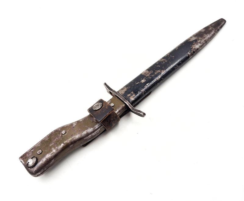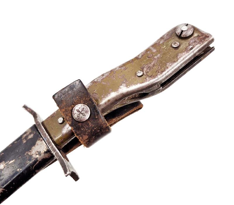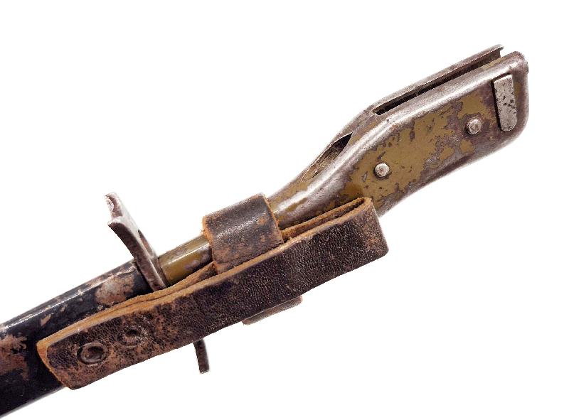 Le fourreau avec sa laque noire d'origine, possède toujours sont brelage cuir d'origine resté bien souple. L'un des rivet de maintien au fourreau est absent.