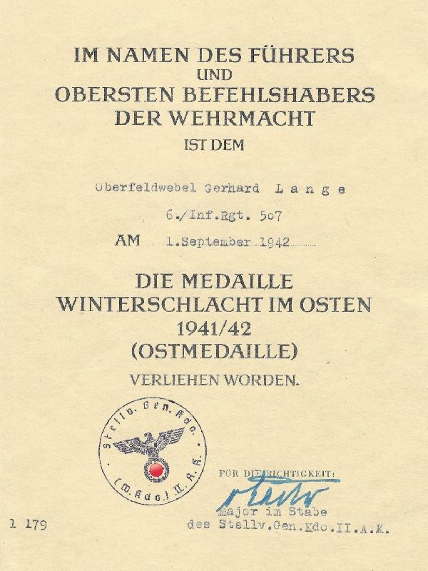 Ensemble d'un même homme comprenant une médaille du Front de l'Est et son diplôme, attribué le 1er septembre 1942 à l'oberfeldwebel Gerhard LANGE servant dans la 6ème compagnie du Infanterie Regiment Nr.507.